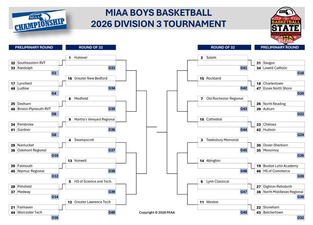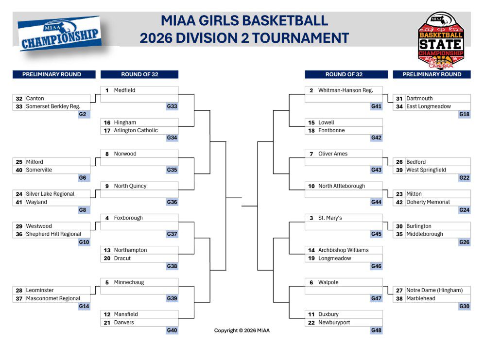 Boys’ basketball had an impressive season as well. Finishing with a 17–3 record, they are sitting in the 8th seed, a massive improvement after last year’s 28th place. They will be playing their first game right after the girls’ team, at 7:00 on Friday, February 27th, in the high school gym. They will be going up against the winner of the Dedham–Bristol-Plymouth Regional Vocational Technical matchup. Dedham has a 13–7 record and is seeded 25th. Bristol-Plymouth also has a 13–7 record but is seeded 40th. Last year, Medfield was knocked out by Greater Lawrence Technical, who last year was 15–8 and seeded 5th, and this year has a 15–7 record and is seeded 12th. If they were to play each other again, it would not be until the semifinals.