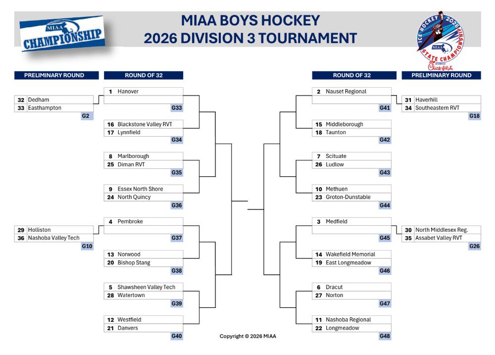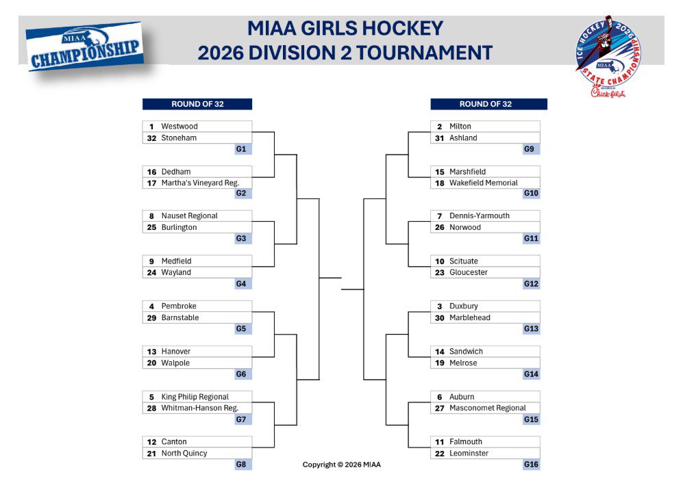 Girls’ hockey are entering their tournament seeded 9th. Last year, they had an amazing postseason run, winning the championship as the 13th seed, knocking out 1st-seeded Westwood in the semi-finals. The Warriors are a younger team this year, but have had a fairly good season regardless, finishing at 13–8. It is possible they will face Westwood (1st seed, 19–1) again, and if they do it would be in the final 8. If they face Milton again after beating them in the finals last year, it would be in the finals again. Milton is 2nd-seeded with a 20–1–1 record. But first, the Warriors will have to have defeated 24th-seeded Wayland (6–12–2) at the Canton Ice House on Wednesday. If they won, they will then play the winner of the Nauset Regional–Burlington game at a place and time that will be determined depending on the winners. Nauset Regional is 12–8 and is seeded 8th and Burlington is 5–14 and seeded 25th.