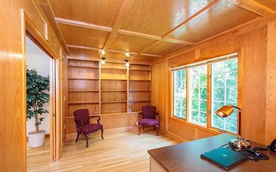 In-home office is clad in oak with open bookshelves and can easily be transformed into a library.