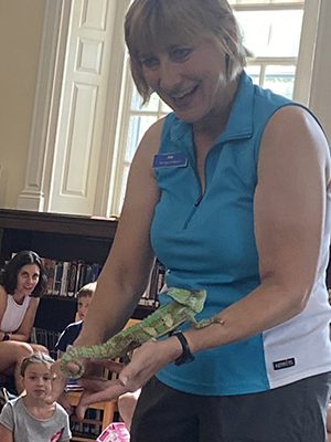 Desert and rainforest creatures were the stars of “Joys of Nature,” sponsored by the Friends of the Medfield Public Library. Head of Children’s Services Bernadette Foley thanked attendees and introduced Joy Marzolf, animal handler and educational program leader.