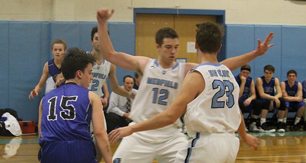Medfield’s Christopher McGory (12) and John Lowell (23) work together under the hoop to box out DS’s Luke Turo (15) for a rebound. Photos by Michael Flanagan No category December 28, 2016 Hometown Weekly Staff No tags