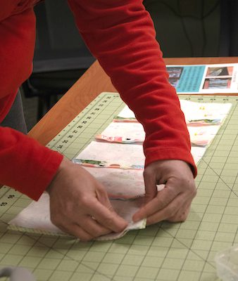 The lesson took everyone through the whole process. Led by Bri, everyone started by picking out their fabrics (all cotton, to avoid any melting in the microwave) in various colors and patterns that will make each neck warmer unique. This was also a low-risk task. Everyone works at different speeds and was free to make mistakes because they were all learning.
