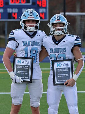 On Thanksgiving, the Warriors (9-1) put an exclamation point on their season with a 48-8 trouncing of the Dover-Sherborn Raiders (3-7). Medfield has won 32 of 60 contests dating back to 1966, including the last three.
