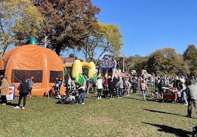 As trick-or-treating wrapped up, groups gathered back on Stone Field. The area had been transformed into an exciting autumn fete featuring a variety of fall-themed inflatables, music, face painting, and balloon twisting. Hundreds of locals of all ages joined in the celebration. It was a great way to spend such a gorgeous late October afternoon.