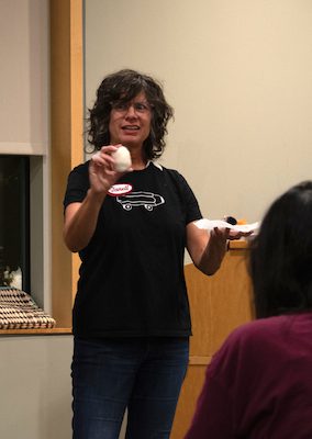 A video demonstration played during the lesson so everyone could learn what to do, but Janell came by and was engaging with each patron. She was patient, told funny stories, and was encouraging with each person while making sure they were staying safe. The point of the lesson is that anyone, with no prior skill or experience, can learn a new craft and it might inspire a passion they can pursue later.