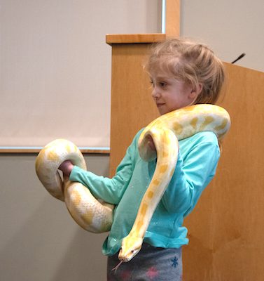 The last animal everyone got a chance to pet was Captain Crunch, the albino Burmese python. Gabriel taught them that she was a constrictor snake, so she relied on squeezing rather than fangs to get her food. But it also made the kids that held her feel like they were hugged by a snake.