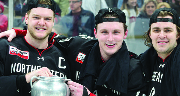 From left-to-right: Eric Williams (C), Walpole native Lincoln Griffin (19), and Canton native Liam Pecararo pose together with the Beanpot trophy after helping Northeastern to its second consecutive and sixth-ever Beanpot championship on Monday night at TD Garden with a 4-2 win over Boston College.